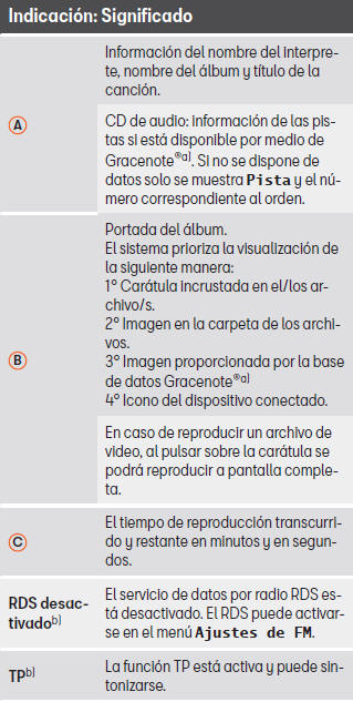 Denominamos "fuentes de Media" a las fuentes de audio o imagen que contengan archivos en diferentes soportes. Estos archivos pueden reproducirse a través de los lectores correspondientes o de las entradas de audio del sistema de infotainment.