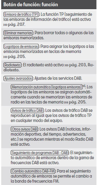 En el menú principal Radio pueden memorizarse las emisoras de la banda de frecuencias sintonizada en los botones de función numerados. Estos botones de función se denominan "teclas de memoria".