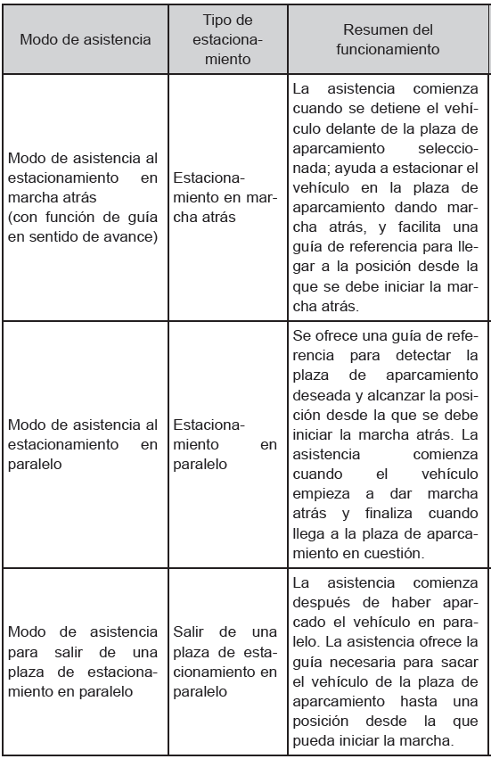Tabla de modos de asistencia y funciones del sistema inteligente sencillo de asistencia al estacionamiento